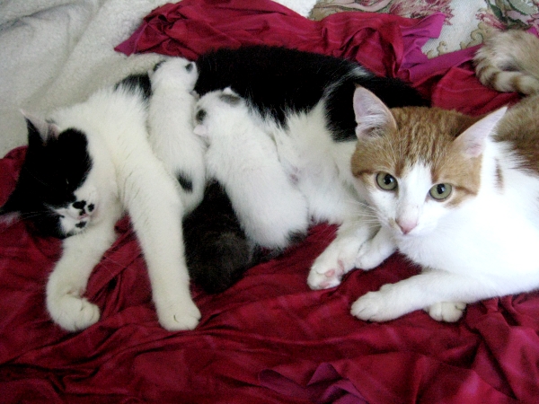 Котики ищут хозяев в г. Симферополе или в Крыму. Возраст - 2 месяца, приучены к лотку. Оба мальчики. Первый котенок - Пятнышко: игривый, активный, но очень ласковый, пьет лапкой из емкости. Второй котенок - Бумбоська: будет крупным котом, спокойный, самостоятельный, игривый и не агрессивный. Окрас - белый, с некоторыми черными пятнышками, на фото они по-отдельности и в компании их мамы с папой. |