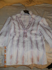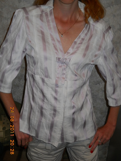 Продам рубашку белая розовую атласную полоску. Состав: коттон+стрейч. С декором в виде розочки на груди. Рукав 3/4. Торг! Пересылка клиента. |