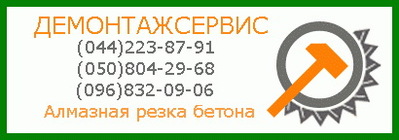 ***Резка и расширение дверных и оконных проемов ***Изготовление отверстий под вентиляцию и под канализацию, алмазное сверление отверстий ***Резка бетона и железобетона ***Изготовление проемов и отверстий любой конфигурации в стенах и перекрытиях ***Исправление дефектов литья бетона при строительстве ***Слом стен и перегородок ***Демонтаж квартир ***Демонтажные работы и услуги ***Перепланировка квартир, офисов и других помещений (044)223-87-91 (050)804-29-68 (096)832-09-06 |