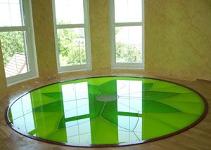 Стеклянные полы: стеклянные ниши, стеклянные ленточные конструкции, стеклянное поле, выполняющее функцию несущего пола. Все слои данного блока могут быть как одной, так и разных цветовых гамм. Сами стекла могут быть тонированными в массе, иметь зеркальное покрытие, быть просто прозрачными, либо комбинироваться с цветными ПВБ пленками. Для монтажа стеклянных панелей используются рамные конструкции и точечные системы крепления. |