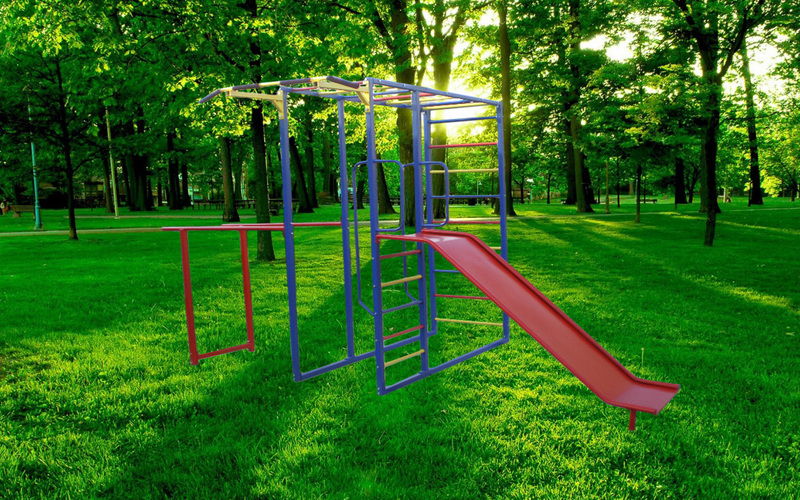 Параметры: высота 230 см, ширина 70 см, ширина турника - 115 см, длина и ширина горки 200*50 см, длина и высота брусьев 120*120 см.