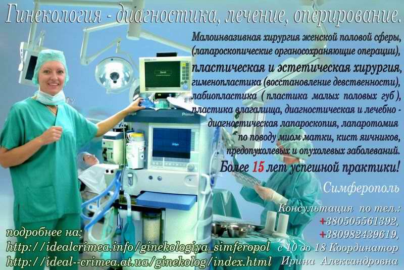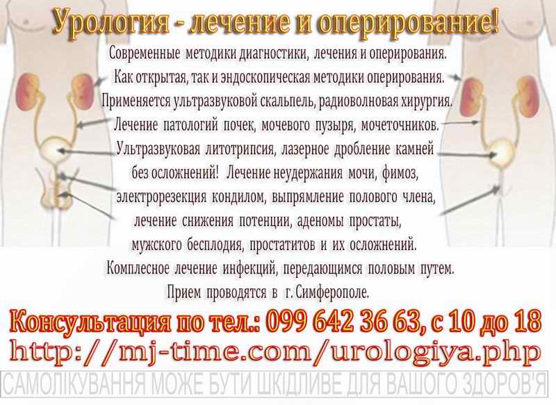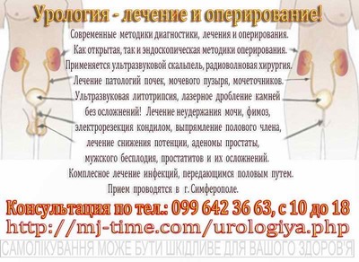 Современные методики диагностики, лечения и оперирования. Как открытая, так и эндоскопическая методики оперирования. Применяется ультразвуковой скальпель, радиоволновая хирургия. Лечение патологий почек, мочевого пузыря, мочеточников. Комплексная диагностика и лечение различных гинекологических заболеваний и инфекций. Минимально травматичные операции - максимально эффективный результат! тел.: 380996423663, с 10 до 18 Администратор. подробнее: http://mj-time.com http://idealcrimea.info/urologiya.php http://ideal--crimea.at.ua/urologiya/index.html http://idealcrimea.at.ua/index/0-46 |