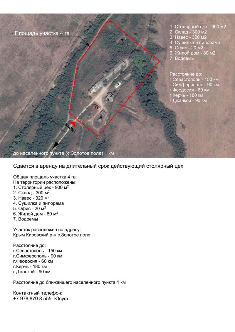 Сдается в аренду на длительный срок действующий столярный цех. Общая площадь участка 4га. на территории расположены: 1. столярный цех – 900 м2 2. склад – 300 м2 3. навес – 32 м2 4. сушилка и пилорама 5. офис – 20 м2 6. жилой дом – 80 м2 7. водоемы Участок расположен по адресу: Крым, Кировский район, с. Золотое поле Расстояние до: г. Симферополь – 90 км, г. Севастополь – 150 км, г. Феодосия – 60 км, г. Керчь – 180 км г. Джанкой – 90 км Расстояние до ближайшего населенного пункта 1 км Юсуф +79788708555 |